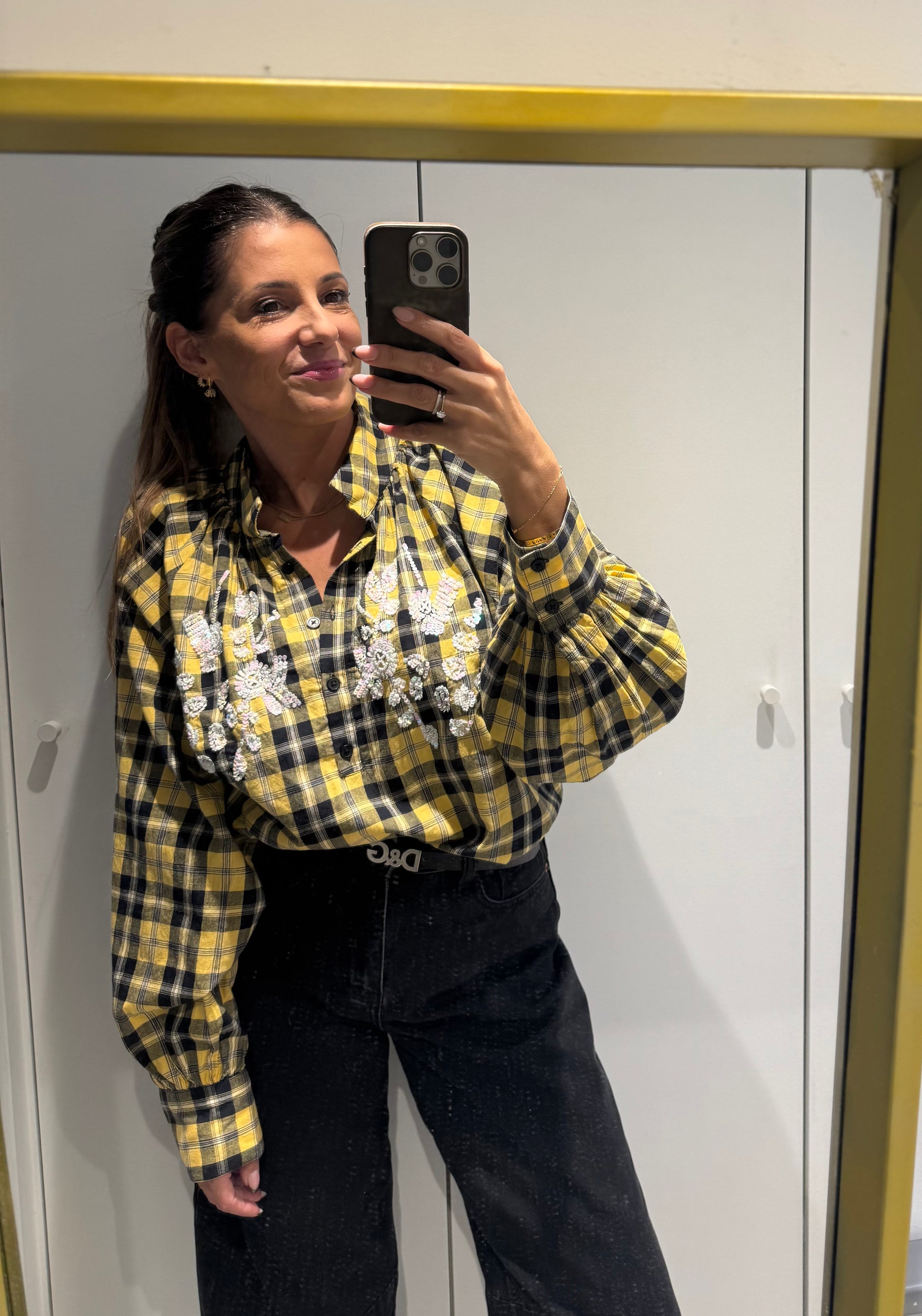 Ruiten blouse afgewerkt met pailletten. Deze blouse bestaat in S/M en in M/L.